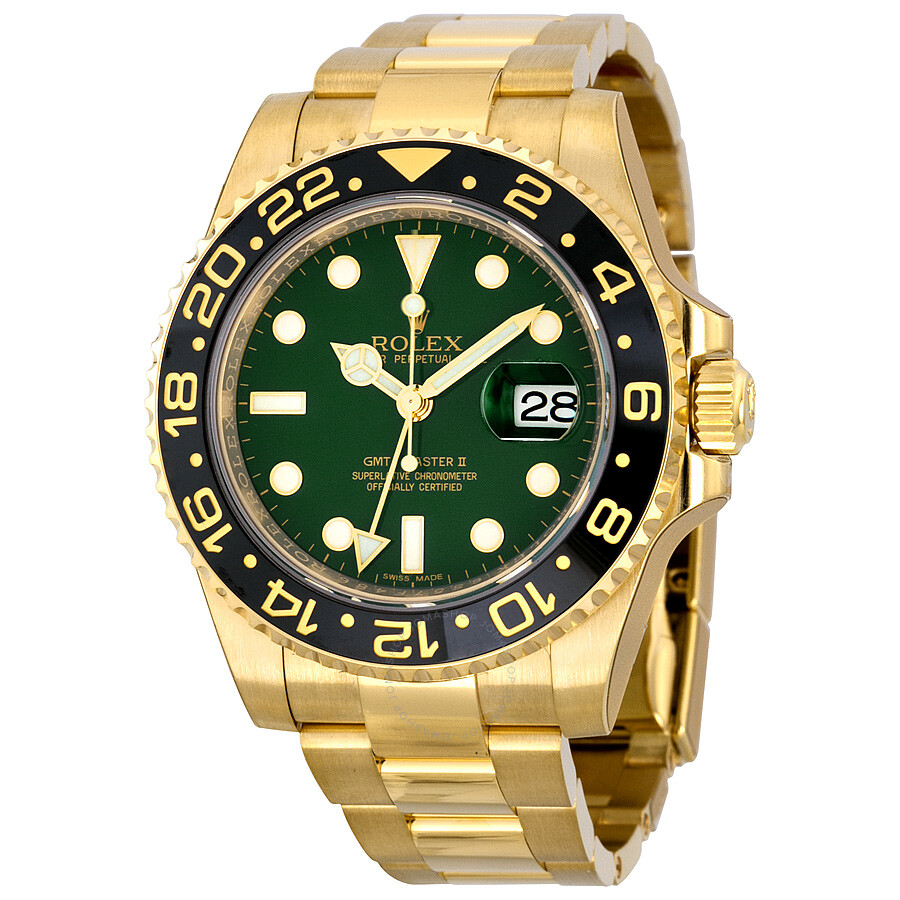 美しいロレックス 116718GSO ウォッチは、18K イエロー ゴールドの 40mm ケース、双方向回転式の 18K イエロー ゴールド ベゼル、傷に強いサファイア クリスタルで覆われたグリーンの文字盤が特徴です。スタイリッシュな腕時計には、快適さと頑丈さを兼ね備えた高級 18K イエロー ゴールド ロレックス オイスター ムーブメントが搭載されています。この最先端の時計には、GMT、第 2 タイムゾーン、日付、時間、分、秒、クロノメーター機能が搭載されています。