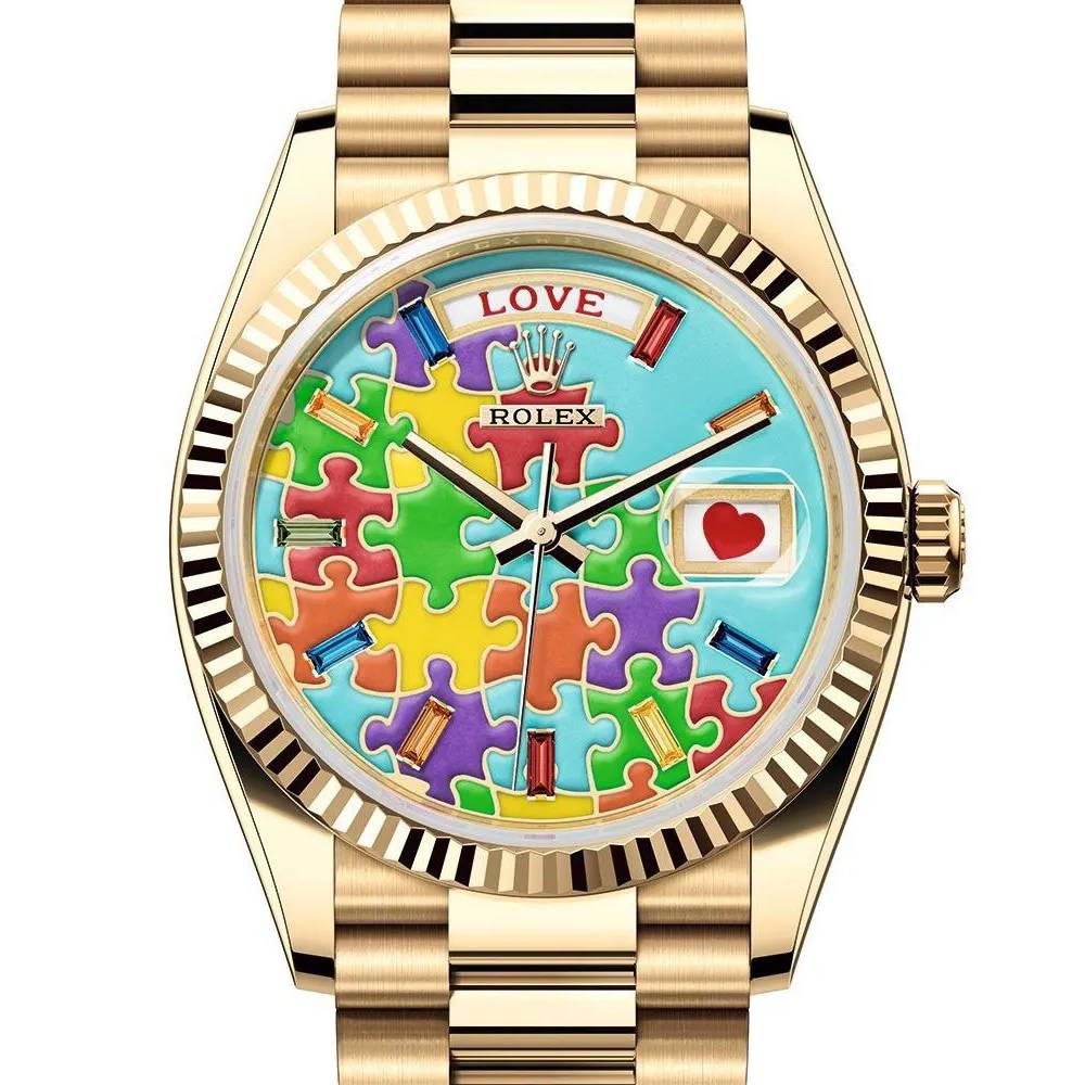 ロレックス デイデイト 36mm - Ref: 128238-0106 - パズル絵文字ジグソーモチーフダイヤル&フルーテッドベゼル、18Kイエローゴールド プレジデントブレスレットウォッチ