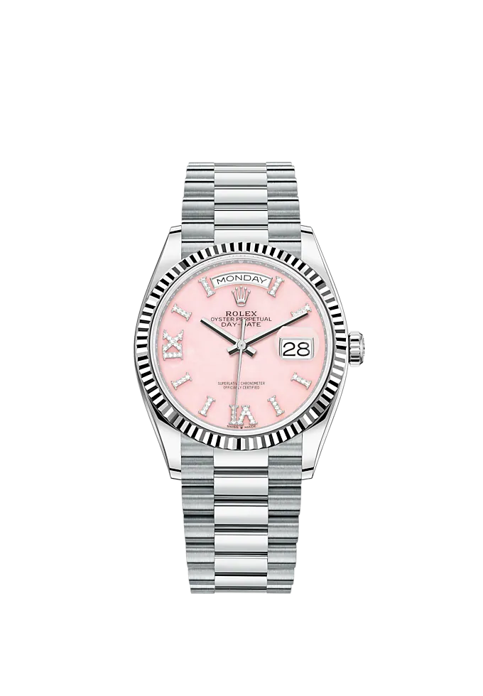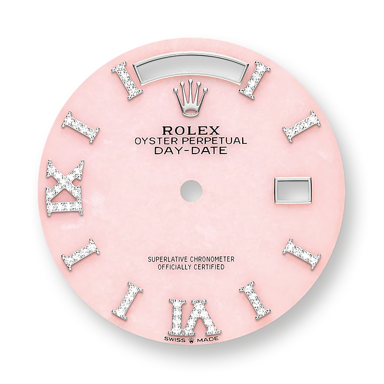 - 文字盤の色: ピンクオパール文字盤、18K ホワイトゴールドのインデックス、32 個のダイヤモンドのアワーマーカー、6 時と 9 時の位置にローマ数字の VI と IX、24 個のダイヤモンドが 18K ホワイトゴールドで縁取られています