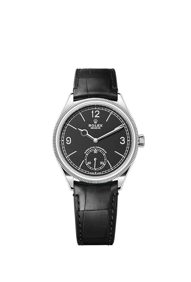 未使用のロレックス パーペチュアル 1908。39mm。18Kホワイトゴールド。Ref. 52509-0002。最高レベルの品質を追求し、完璧で永続的な結果を実現することがロレックスの哲学です。この精神に基づき、世界的ブランドは新たな名称と新たな外観を持つクラシックなコレクションを開発しました。控えめながらもドレッシーで、ビジネススーツにも最適なロレックス パーペチュアル 1908。文字盤に「Rolex」の文字が初めて登場した年に敬意を表したパーペチュアル 1908 モデル全体は、時計職人による初の自動巻きローター搭載モデルからインスピレーションを得ています。その証として、美しく細長い18Kホワイトゴールドのアプライドインデックスと、12時、3時、9時のアラビア数字が配された、息を呑むほど美しいインテンスブラックの文字盤が挙げられます。6時位置にはスモールセコンドダイアル。想像以上にスポーティなデザインです。 20、40、60のトラック付き。先端にリングが付いたクラシックな時針とエレガントな剣型の分針。18Kホワイトゴールド製。文字盤の外側の輪郭に沿って、見やすい分目盛りが施されています。この魅力をすべて、快適なグリップのためのリブ付きで補完しています。ロレックスのロゴが入った18Kイエローゴールドのドーム型ねじ込み式リューズ。文字盤は傷のつきにくいサファイアクリスタルで覆われています。モデルのハイライトは、凸型で触り心地の良い上部と特徴的な溝付きの下部を備えた2層の18Kホワイトゴールドベゼルです。このモデルは、ロレックスの自社製自動巻き機械式ムーブメント、キャリバー7140によって駆動されています。2023年新作。38石で構成され、約66時間のパワーリザーブを備えています。魅惑的なメカニズムの動作は、透明なケースバックから見ることができます。この印象的な時計は、グリーンの裏地とトーンオントーンのステッチが施されたマットブラックのアリゲーターレザーストラップが付いています。このモデルのためにカスタムメイドされました。18Kホワイトゴールドのデュアルクラスプフォールディングクラスプが取り付けられています。丁寧に形作られたデザインにより、デュアルクラスプは常に手首の中央に配置され、最高の快適さを提供します。50m/165フィート(5気圧)までの防水性能を備えています。